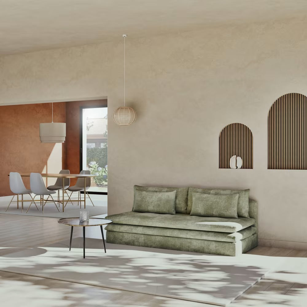 Craquez pour le charme du canapé convertible CLIO en tissu recyclé beige, parfait pour vos moments cocooning.